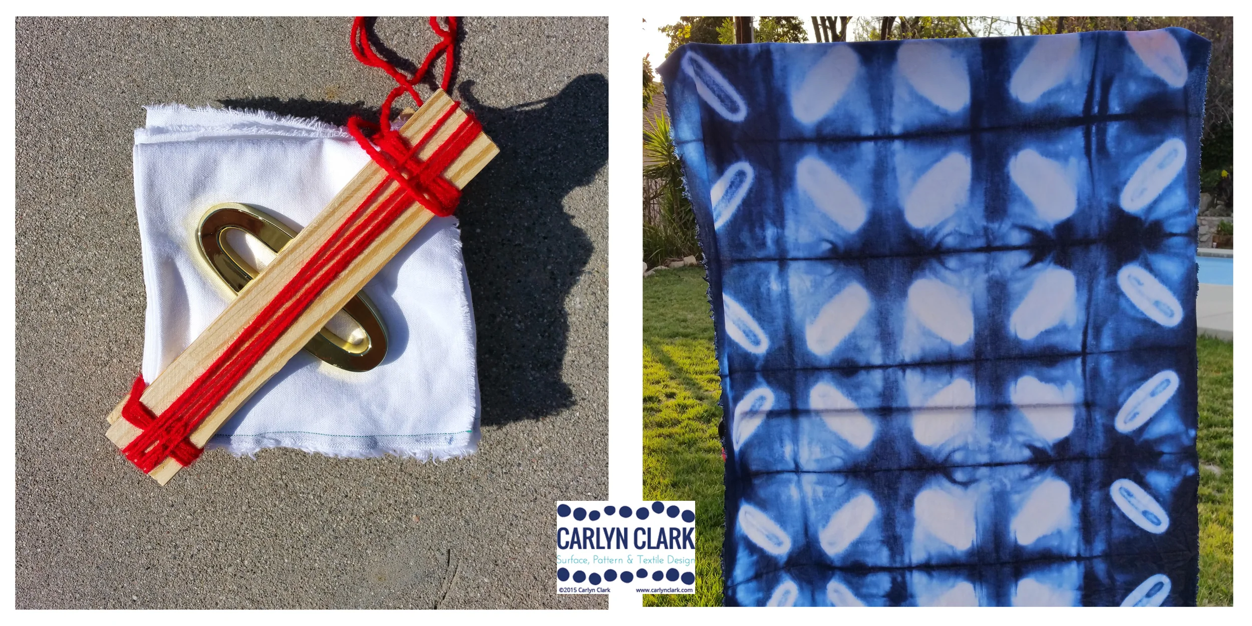 The first day of daylight savings time is probably my favorite day of the year. It's all about the promise of long, warm afternoons and evenings on the patio. You know that the short, dark days will soon be over. The seeds you planted are starting to pop up which reminds you that you'll soon be eating fresh tomatoes and barbecuing. When I woke up to glorious sunshine and the promise of 75+ degree day I decided to spend it in the garden trying out some new Shibori folding and dyeing ideas. Photographed above is a piece of 100% linen that I accordion folded into squares and then used two house numbers to create an oval pattern. I tied it all down with some scrap yarn and dyed it my favorite deep blue. Next I'll begin manipulating it in Photoshop and Illustrator to creat a repeating pattern.